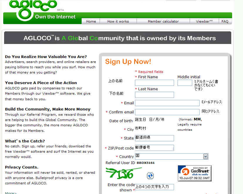 えーっと今日が始めての記事ですので。よろしくお願いします。 本題ですが、みなさんはAgloco(アグロコ)をしっていますか? もう知っている方も居られると思いますが、アグロコとは間単に言えば「小遣い」をもらうことができるのです。 創立者には、スタンフォードの学生達と、1999年に、AllAdvantageを立ち上げた数名のメンバーが含まれます。 AllAdvantage(オールアドバンテージ)は、数百万人の会員を抱え、 1億ドル(約120億円)を会員に分配した実績があります。 そのうち、googleの利益の半分になるとさえ言われています。 2007年7月1日までに1000万人のメンバー登録を目指すキャンペーンもスタートしました。 GoogleやYahooのように、インターネット・スタンダードとして多くの人が利用することになりそうです。 あなたは、まず会員登録をして無料ソフトウェアのViewBarをダウンロードしてそれをネットする時に起動しておくだけでいいんです。 お金も掛かりません。逆に貰えます。 -登録の仕方- まずhttp://www.agloco.com/r/BBDX5161 に行って会員登録をします。(かなり混雑していますので、繋がらないときもありますが、なんとかがんばってください。 朝はけっこう行けるとおもいます) ↑の画像にみたいなサイトに行きますので、画像にしたがって入力してClick Here to Join をクリックして登録してください。 そうすると登録したメルアドにメールが届きます。そのメールのアドレスをクリックしてhttp://www.agloco.com/web/guest/signin へ飛んでください。そして Sign in をクリックして 登録したメルアドをメールに書いてあったパスワードを入力してSign in してください。 そうすると、新しいパスワードの入力が出てきますので自分のわかりやすいパスワードを打って Save を押せば完了です。 あとは、ViewBarをアグロコのサイトからダウンロードしてインストール。起動させてIDとパスワードを打てば、ViewBarが下に出てきますので、あとは自由にネットサーフィンを楽しんでおくだけです。 今のところ、月5時間までを対象にしているらしいです。 なにかわからないことがありましたらメールしてください。 |